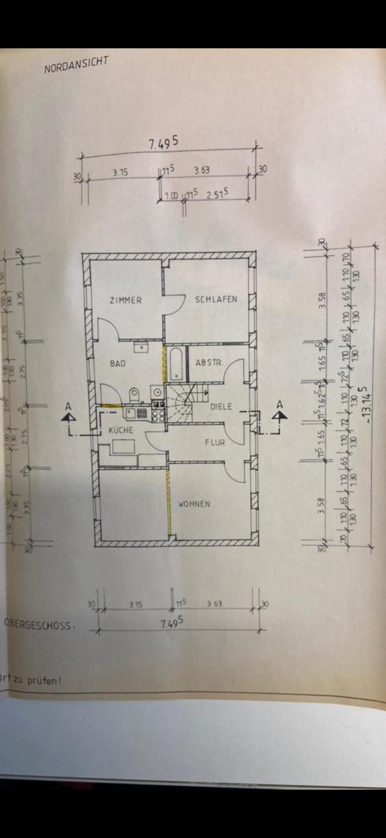 Schnitt: Jeweils vier Zimmer/Etage, in der Mitte jeweils Badezimmer und Küchen.