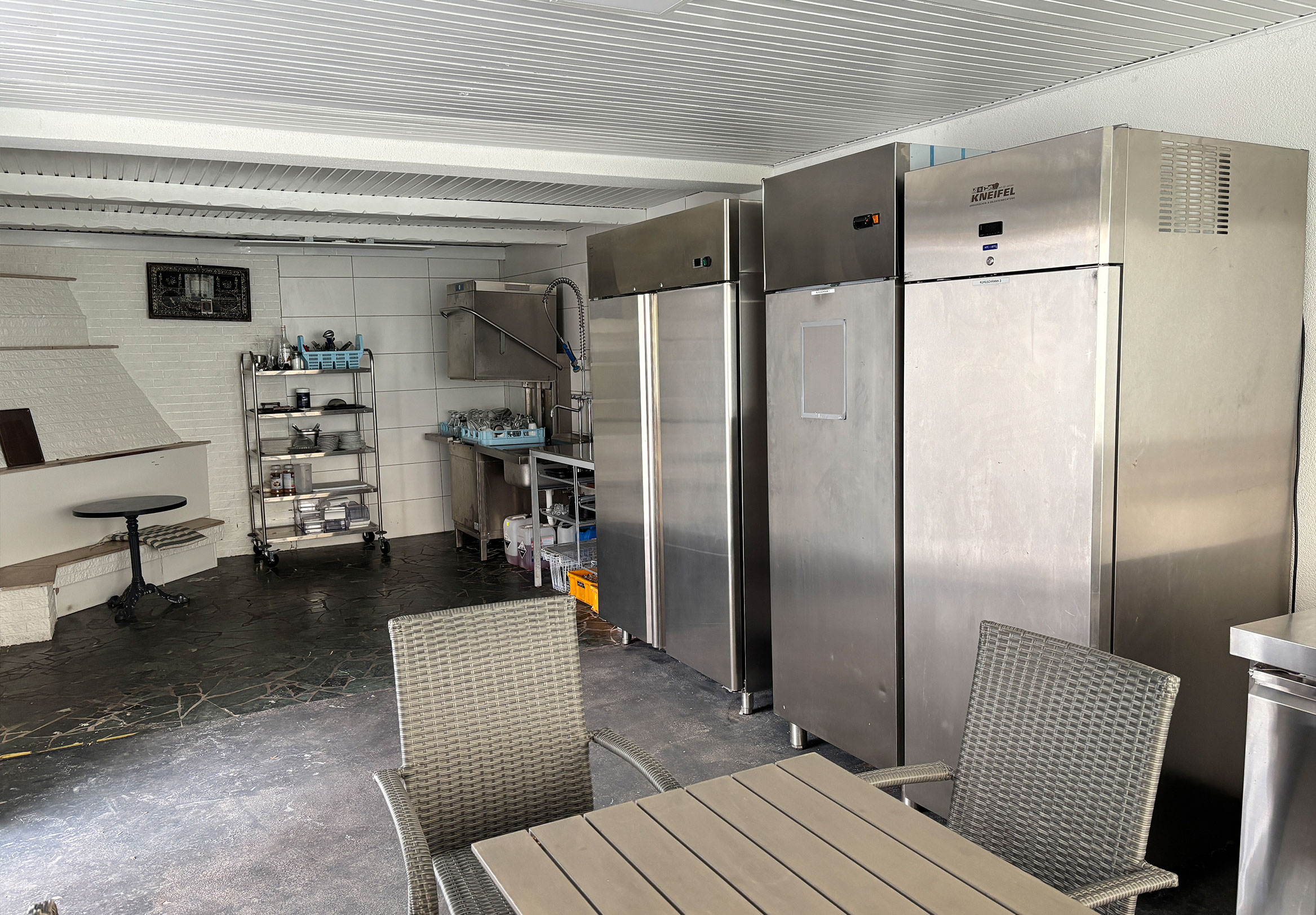 Zur Ausstattung gehören unter anderem Eistheke, Tiefkühlgeräte, Kühlschränke, Kaffeemaschine, Spülmaschine, Getränkekühler sowie komplette Möblierung mit Tischen und Stühlen für über 50 Gäste. Die vorhandene Einrichtung befindet sich in sehr gutem Zustand und hat einen geschätzten Wert von über 50.000 €.
